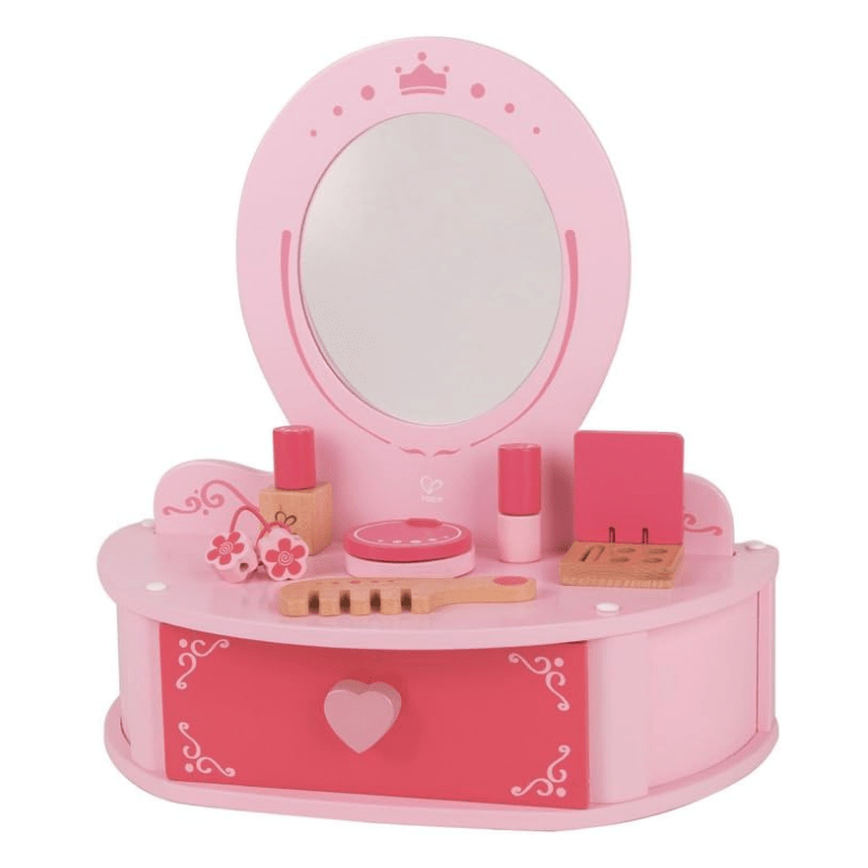 Let your little princess practice her future makeup skills with the Petite Pink Vanity by Hape. This adorable little play makeup counter includes all the accessories your child needs to look her best. Designed for imaginary play, the counter features everything your child could want for a makeup set. Check your look in the built-in mirror, and imagine applying powder with the wooden puffs. Brush your hair with the wooden brush and spritz a little perfume on with the pretend perfume bottle. All durably built from wood, the accessories are safe for your child’s use and are finished in lovely red and pink paints. When done preparing for a pretend day at the office or an imaginary night on the town, stow away the makeup tools in the beauty counter’s drawer. Safe to use and great for playing house, your child will love imagining her future makeup artistry with the Hape Toys Petite Pink Vanity playset.