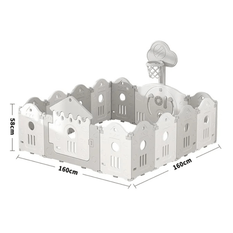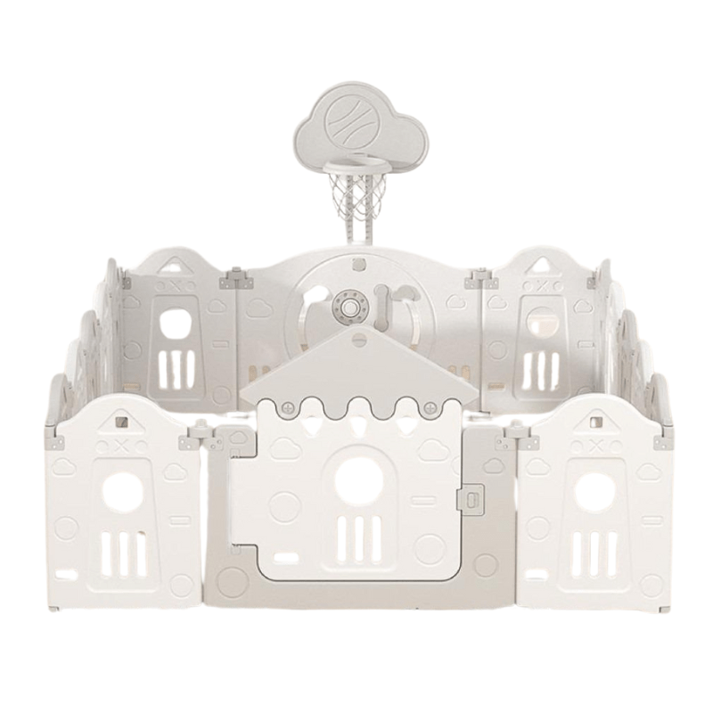 The Little Angel Baby Fence Foldable Playpen & Basketball Hoop is ideal for any home as it is adjustable and can be manipulated into various shapes like squares, rectangles, hexagons, or octagons to fit any space! Whether you live in a small apartment or have a huge yard! The playpen is designed and built with your child’s safety in mind! The playpen is sturdy and features thick panels that won’t tilt or fall, and double knob hinges- to keep panes connected and round corners. It has a no-gap design- to prevent the baby from getting stuck. The external safety lock always keeps your kids inside the playpen securely while playing. Our playpen is assembled of small Grey and White panels, a door panel, an activity/game panel, and a basketball hoop. When finished playing easily tuck the playpen’s panels away! Altogether it is a set of 14pcs(12pcs+1Door+1 Game/Activity Piece) with a basketball hoop.