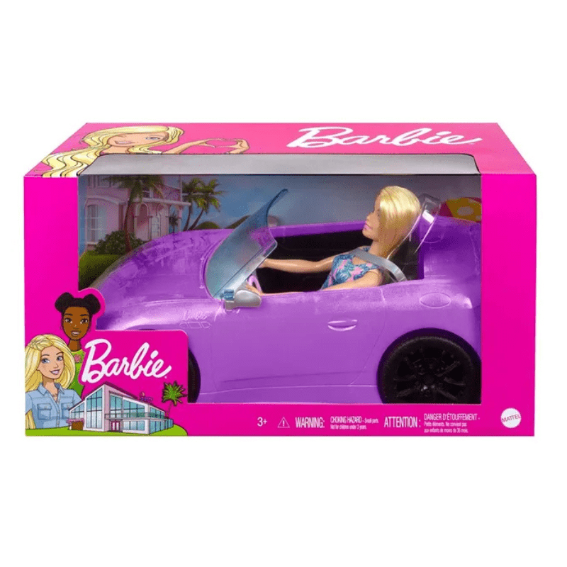 This doll and vehicle playset features a stylish, open-top car with a sporty shape, seating for two, and realistic details, like a matte black grille and wheels, seatbelts,s and silvery accents. Fun touches with signature Barbier style include a personalized license plate and Barbier silhouette hood emblem