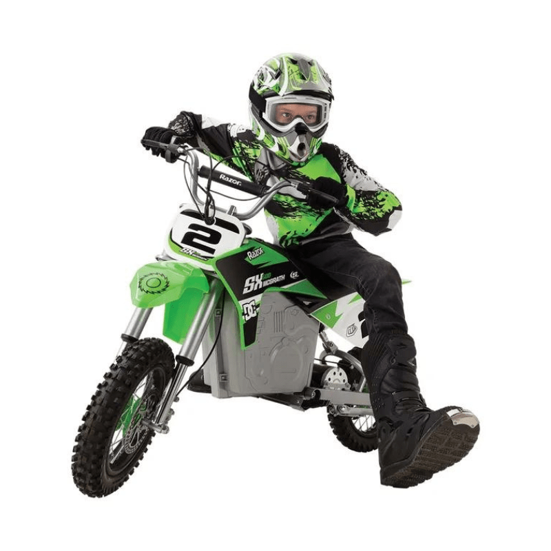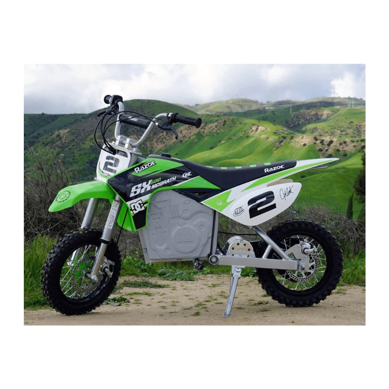 FIT FOR A KING: Inspired by the winningest motocross rider in history, King of Supercross – Jeremy McGrath, the SX500 McGrath features authentic McGrath graphics and fairing design, genuine dirt bike frame geometry, and a high-torque, variable speed motor for a super-charged experience. RIDE LIKE A CHAMP: Features dual suspension and riser handlebars, large pneumatic knobby tires, retractable kickstand, and hand-operated dual disc brakes.
