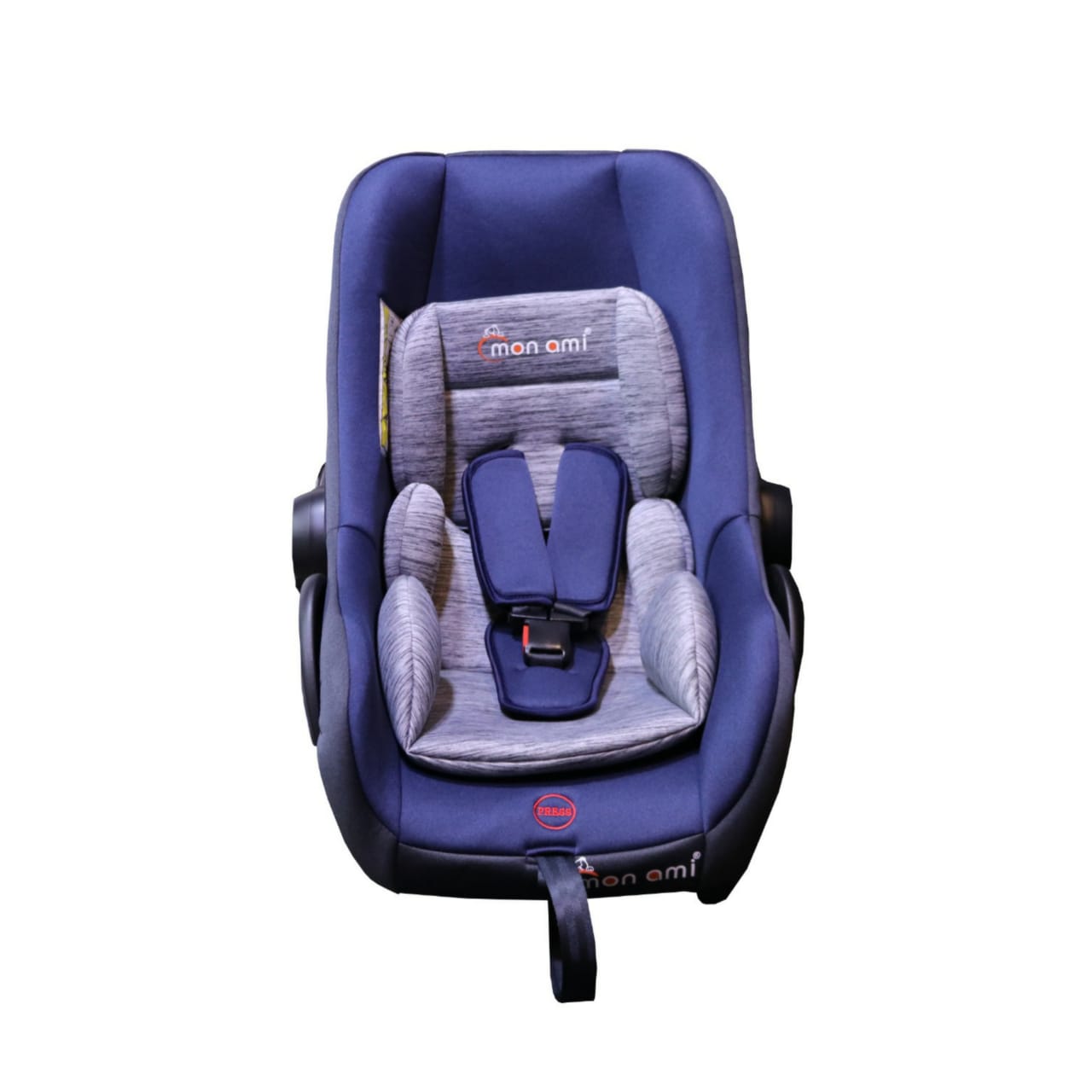 The pictured baby car seat features a 3-point belt harness system. The adjustable three-position handle allows easy carrying. It is designed with a soft inner sheet at the head and hips parts, offering gratifying warmth. This baby car seat comes with a removable canopy for blocking sunshine.