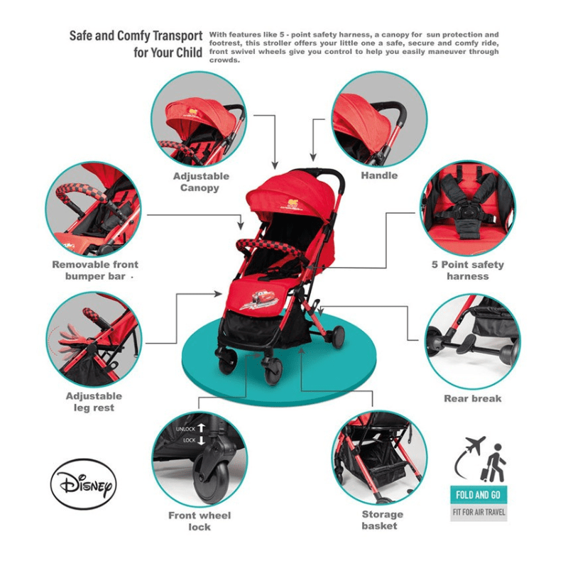• LIGHTWEIGHT, COMPACT DESIGN – A lightweight stroller makes any outing a little easier; The Disney Cars Lightning McQueen Travel Stroller lightweight frame(7 kg)for quick pick up and go