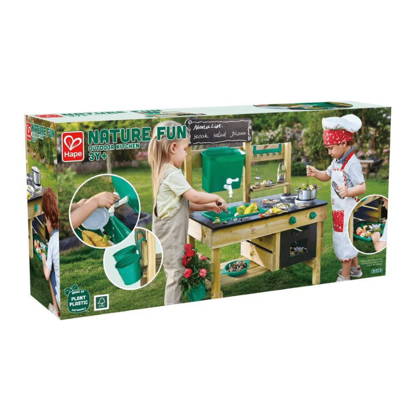 Invite your guests over for a delicious meal and cook for them outside in the garden with this wonderful outdoor kitchen! Includes lots of cooking accessories and even flower pots so you can plant some flowers or vegetables on your own! Made using sustainable Green PE plastic and FSC wood.