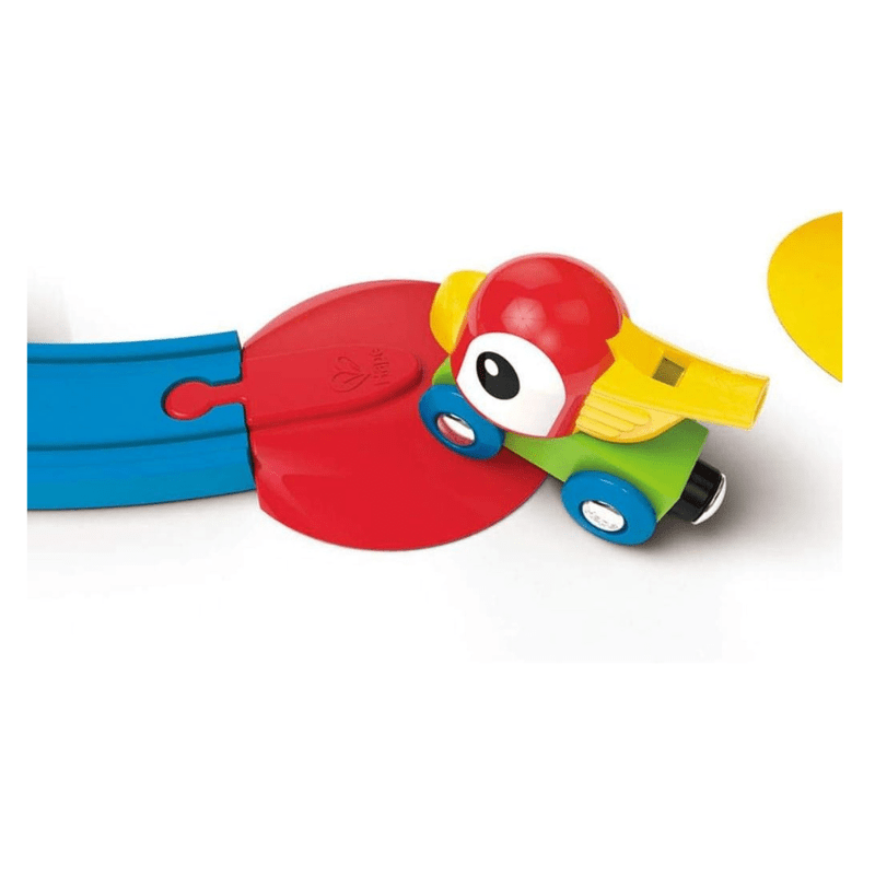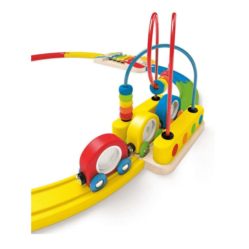 Make playtime learning time with this colorful rail set. Solve the bead maze and shape sorter as you drive the animal train around. Includes xylophone and tambourine musical tracks.