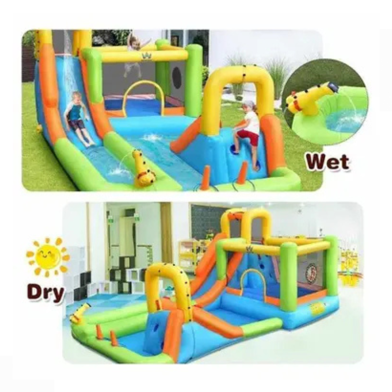 Multi-Functional Play Center: Includes a climbing wall, water slide, splash pool, and bounce house.