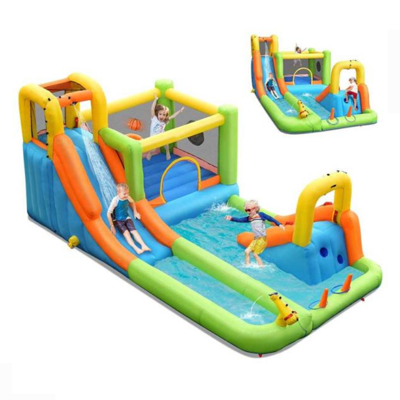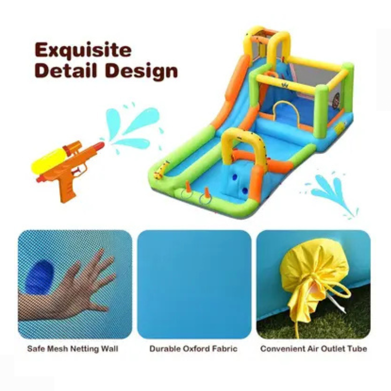 Turn your backyard into a fun-filled water park with this Inflatable Water Slide and Bounce House Combo! Perfect for sunny days, this vibrant play center features a tall climbing wall, a refreshing water slide, a spacious splash pool, and an enclosed bounce house area with a basketball hoop. Made from durable, puncture-resistant materials, it’s designed to provide endless entertainment and active play for kids. Multiple water spray zones add extra excitement, keeping kids cool while they slide and splash!