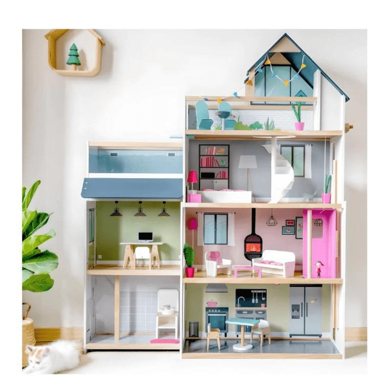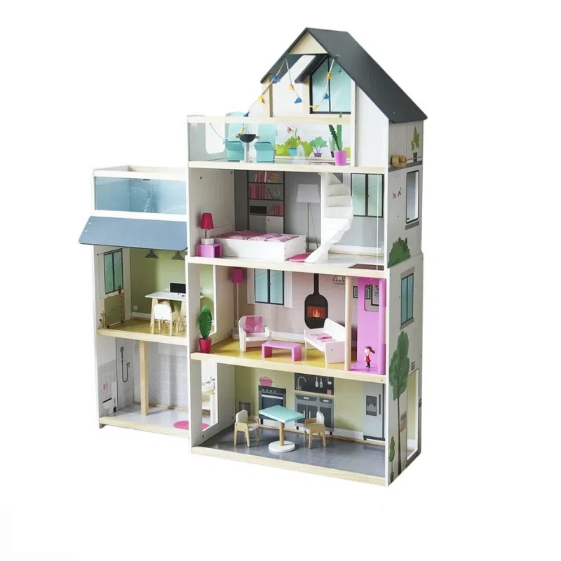 The Little Angel Kids Wooden Furnished Doll House Toy Play Set has a colorful and modern 3-storey house design with a pool. The doll house features a fully furnished bedroom, a living room, a kitchen, a bathroom, a dining room, and a terrace area, all in sturdy wood. A lovely, fun activity toy playset for kids to play with their parents or even siblings to play with that helps develop cognitive, motor, and social skills.