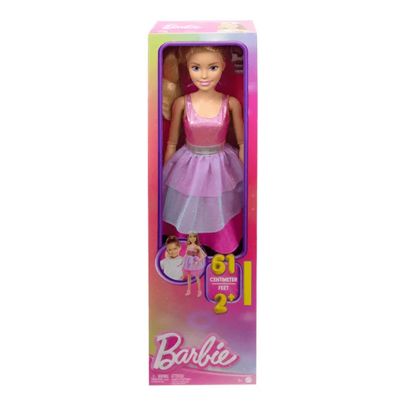 Colors and decorations may vary. Shimmering in pink, this large Barbie doll stands over two feet tall! Her fancy dress and accessories set the scene for storytelling whether she’s going to a birthday, tea party, or fun soiree! Barbie doll has straight blond hair and wears a pink tiered dress. The sparkly bodice is accentuated with a silvery belt, and her pink boots tie the whole look together! Kids can play dress-up on a bigger scale!