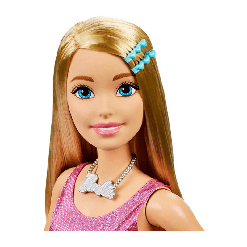 This poseable, large Barbie doll has the same Barbie charm that kids know and love but expanded to a 28-inch-tall frame. After all, more Barbie means even more fun! She rocks a shimmery pink dress accented by a silver belt, a necklace, and two hair clip accessories. Doll cannot stand alone.