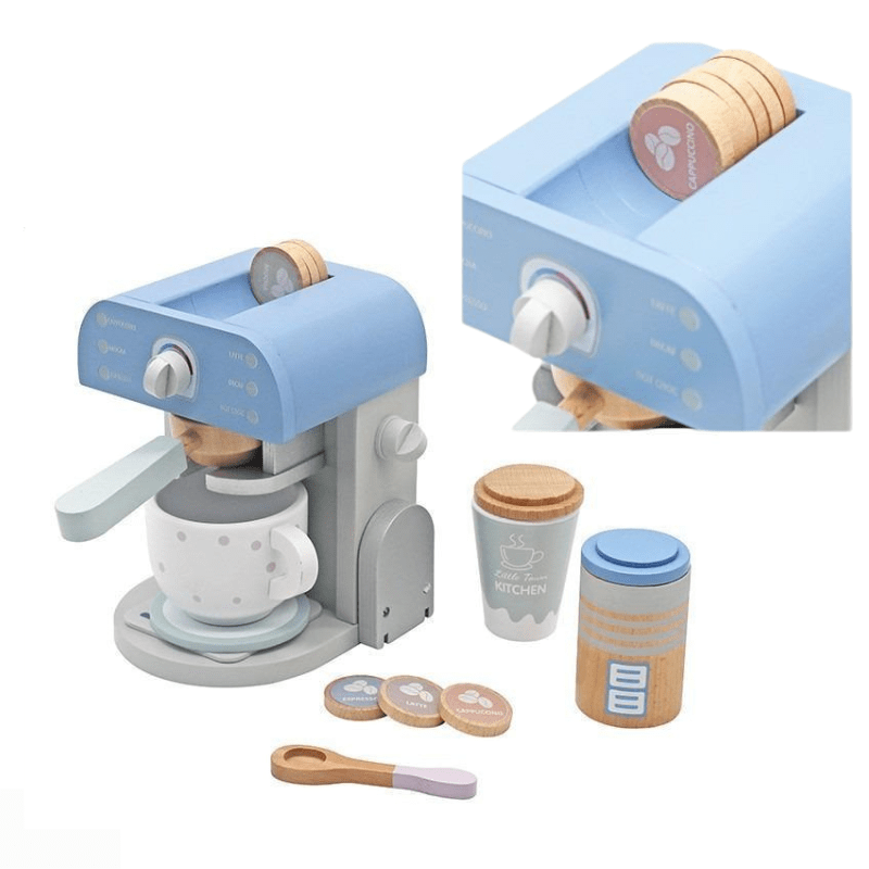 Delight your little one with our Wooden Pretend Coffee Maker Set! Perfect for creative role-play This mini barista toy includes coffee pods, cups & more. Safe, stylish & fun for kids ages 3+.