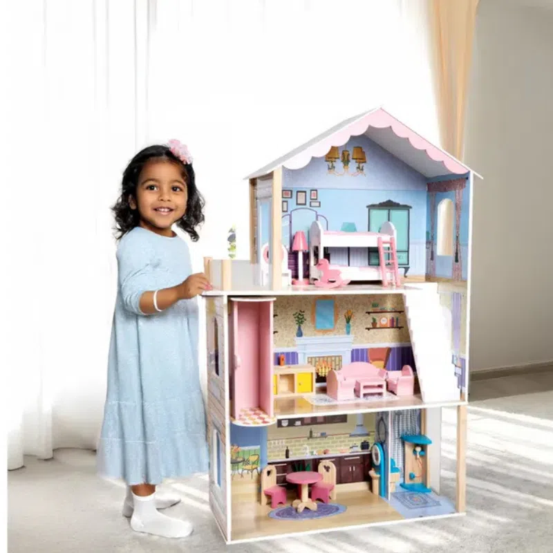 Bring the charm of a summer villa into your child’s playroom with this beautifully crafted Summer Villa Wooden Dollhouse. Standing at an impressive 115 cm tall, this spacious, three-story dollhouse is designed for immersive play, complete with realistic decor and delightful furnishings. With rooms spread across three levels, including a cozy attic bedroom, a chic living room, a kitchen, and even a bathroom, this dollhouse is perfect for hours of imaginative fun.