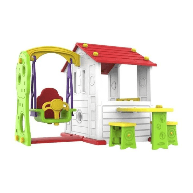 - Includes a Playhouse with openable door, A slide, baby swing & a basketball hoop.