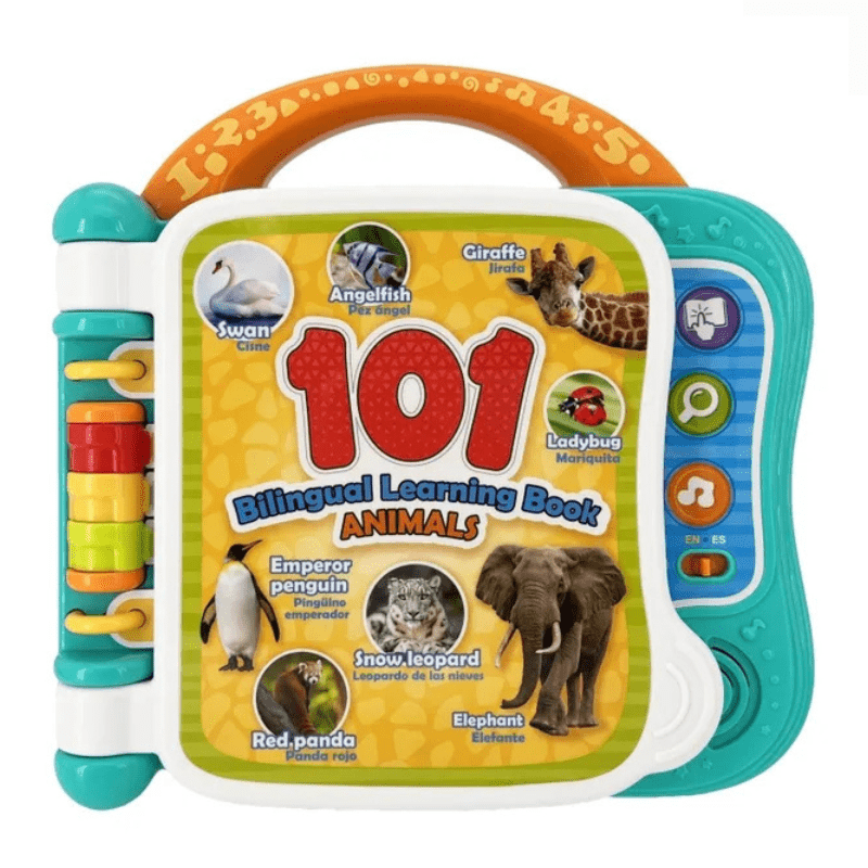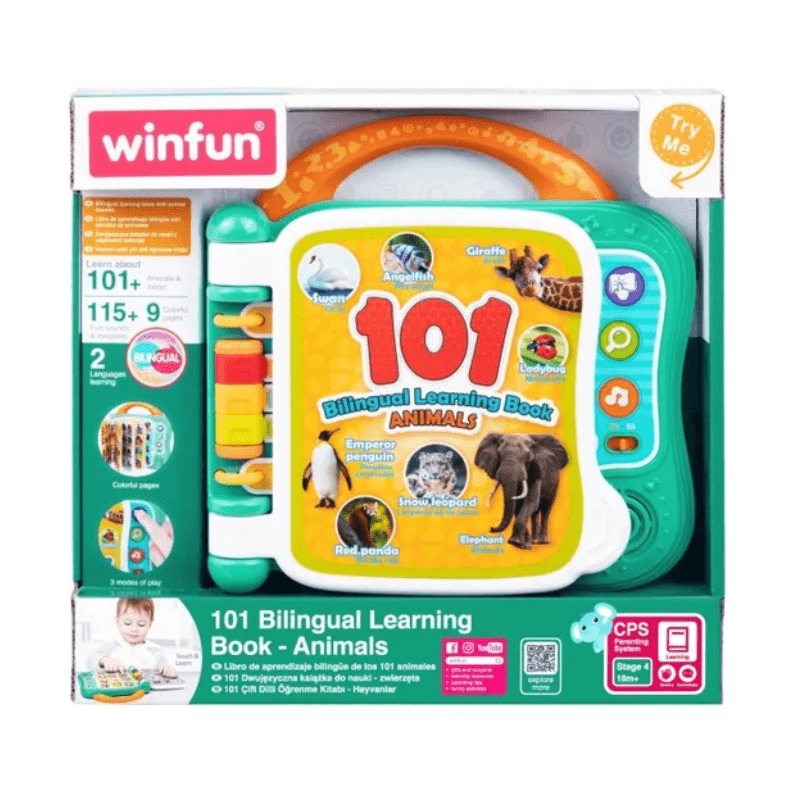 Interactive, bilingual learning book teaches 101 animals in two languages. 3 modes of play: Learning mode – Learn the animal names and their sounds. Question mode – Find the correct animal. Music mode – Play fun sounds and melodies.